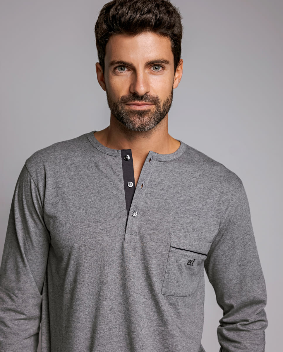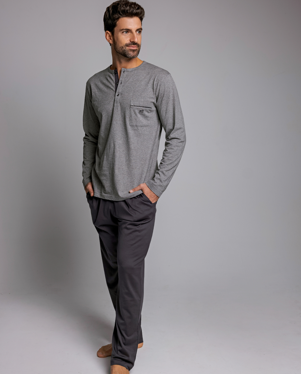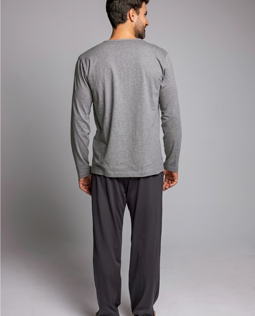 Men’s pyjamas set composed of a plain dark grey trousers and a grey T-shirt with a baker’s collar. Its high quality material, 100% mercerized Egyptian cotton, is a luxurious fabric of great comfort, with a soft touch and exceptional shine. Feel your skin’s comfort and enjoy a restful sleep.