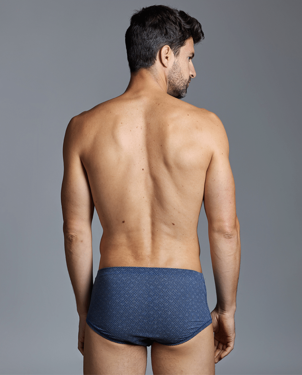 El slip Senior Arrow atlántico con abertura, pertenece a nuestra nueva colección primavera-verano 2024. El estampado en colores azules es una serendipia de “accidentes geométricos”, como la sombra proyectada de la rejilla de una pérgola o una persiana.